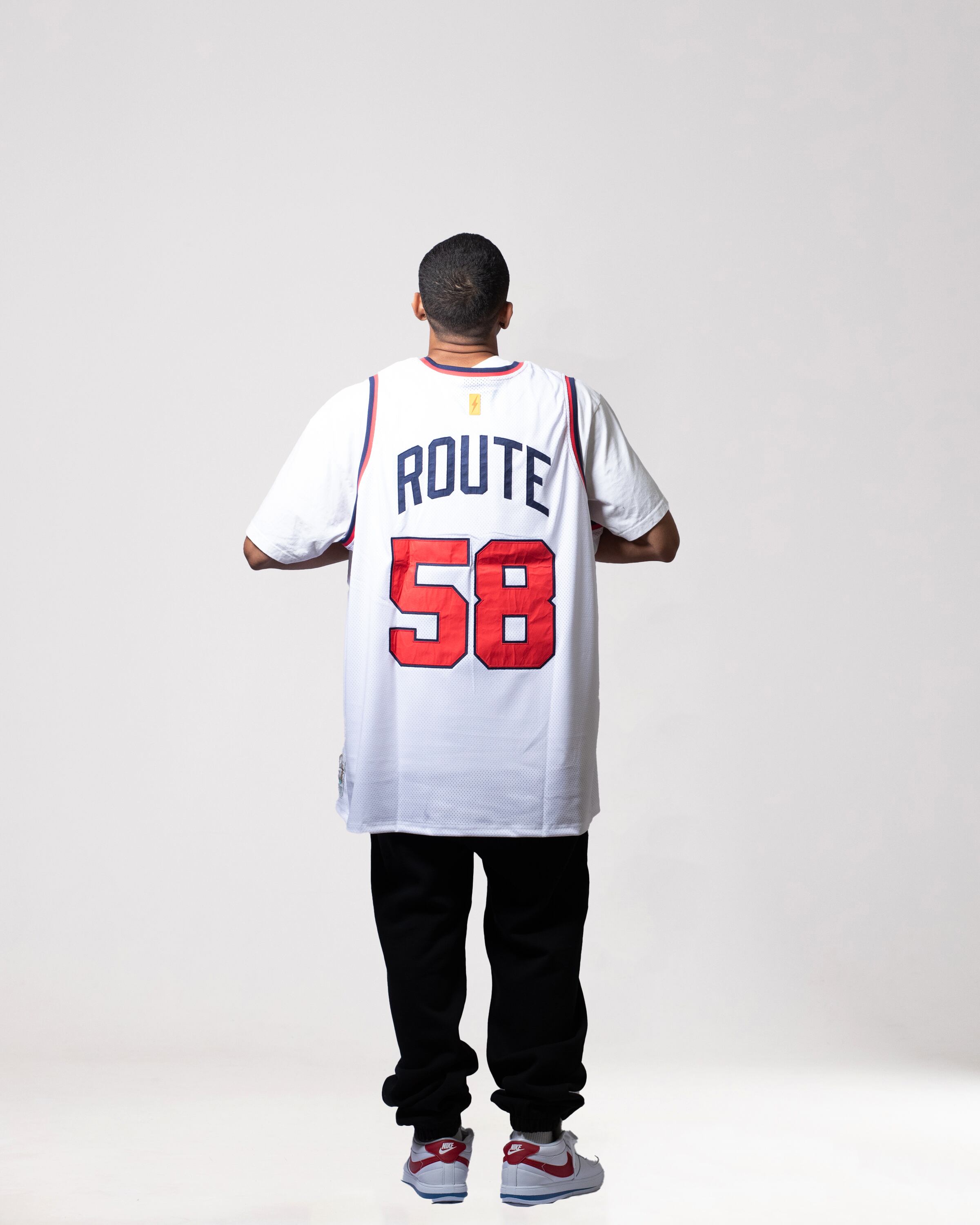 ・着丈部分にはSOUTHオリジナルタグを縫い付け、ひと味違うバスケウェアを演出。