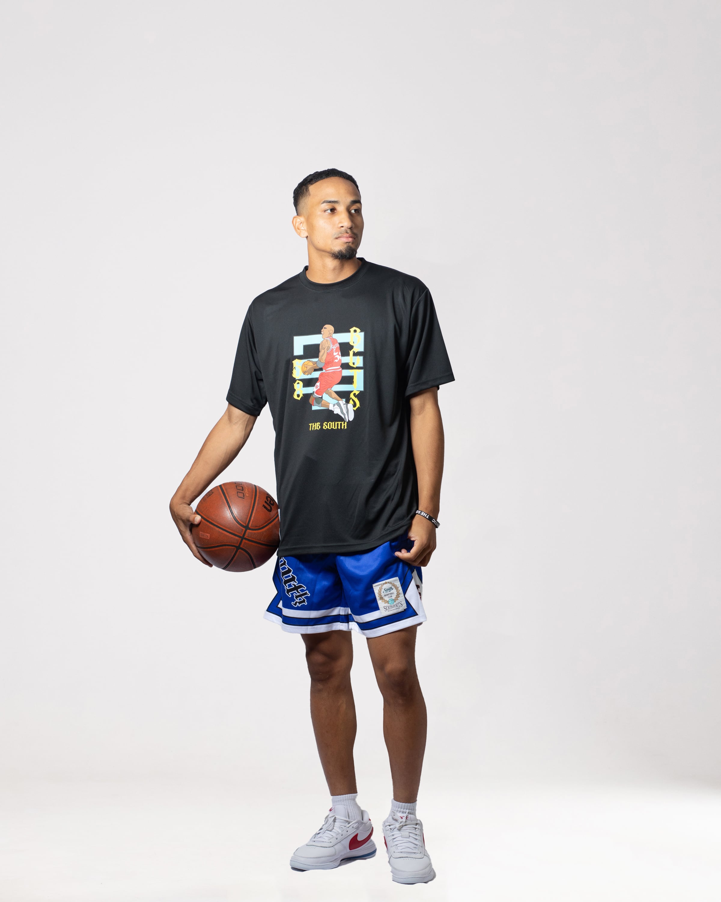 ・着丈部分にはSOUTHオリジナルタグを縫い付け、ひと味違うバスケウェアを演出。