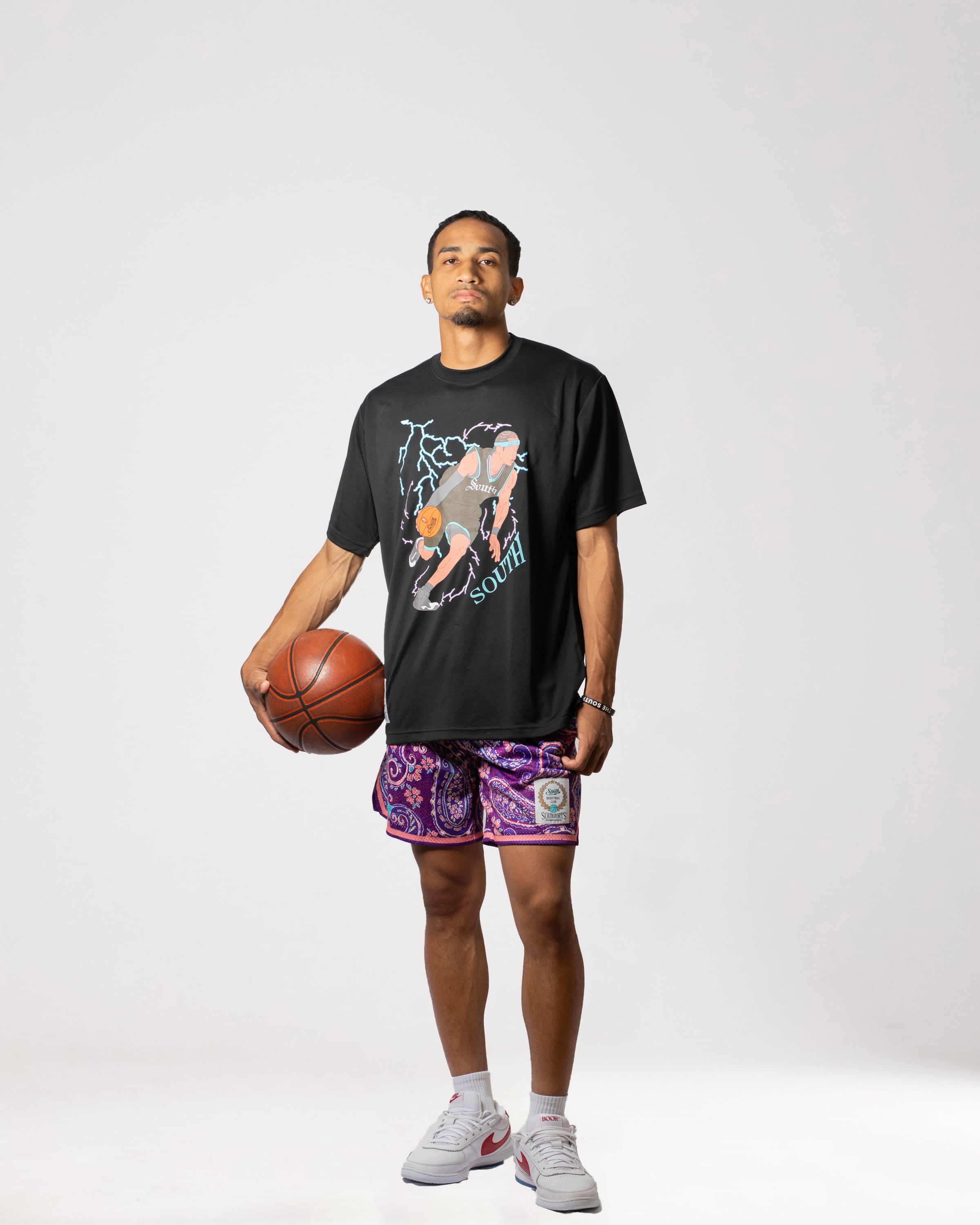 ・着丈部分にはSOUTHオリジナルタグを縫い付け、ひと味違うバスケウェアを演出。