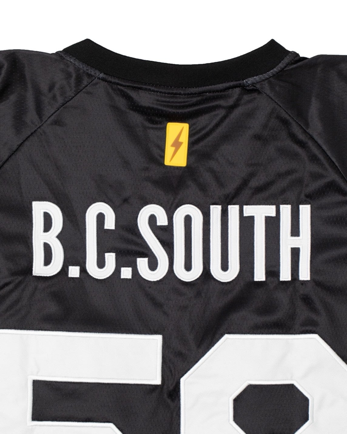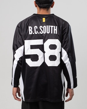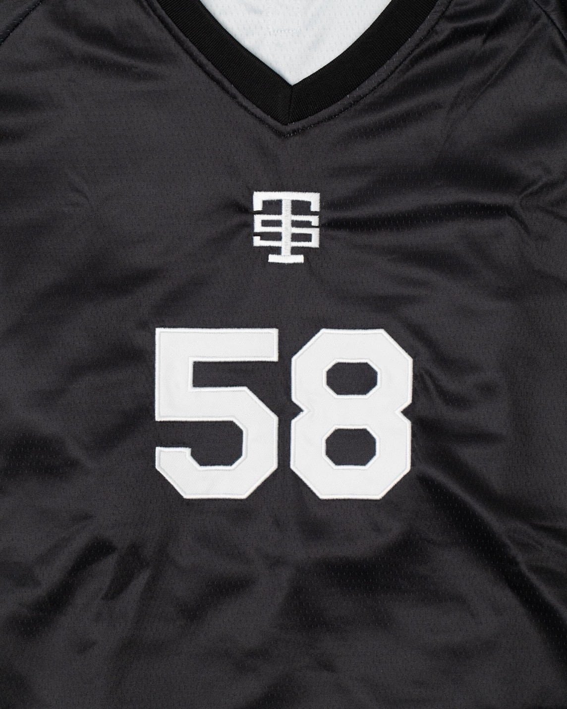 ・フロントの「58」ナンバリングと胸元のシンボルロゴが存在感を放ち、袖にはブランドの筆記体ロゴを刺繍。