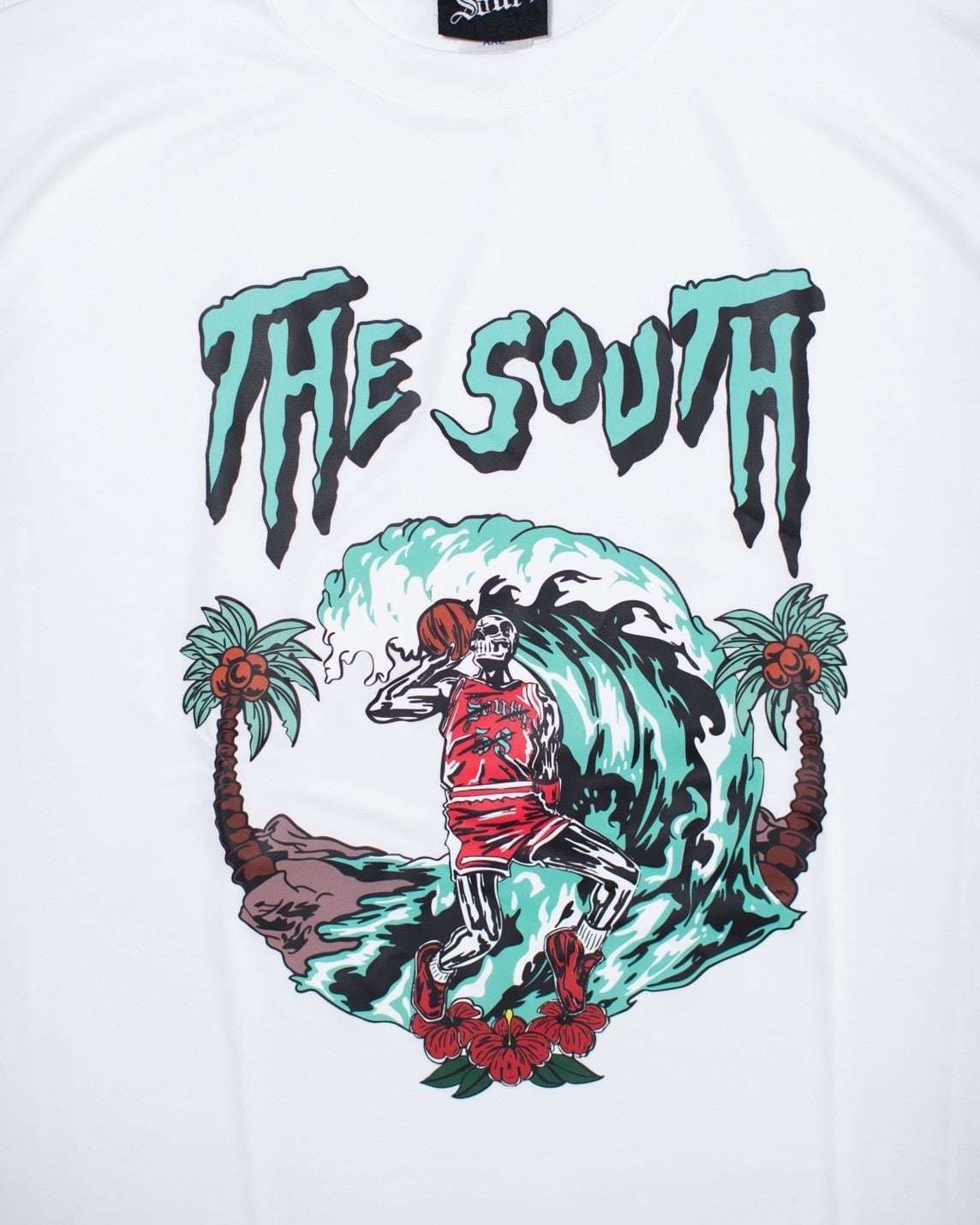 ・着丈部分にはSOUTHオリジナルタグを縫い付け、ひと味違うバスケウェアを演出。